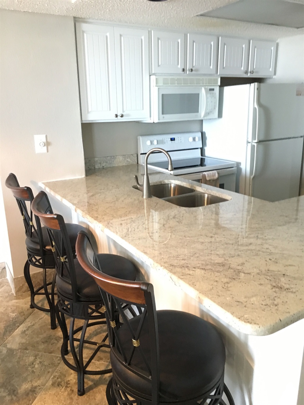 We have beautiful 18" tile throughout the condo with luxury vinyl planks in and the bedrooms.